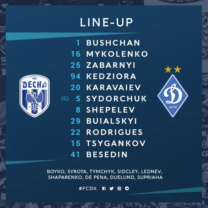 Динамо: Бущан – Кендзьора, Забарний, Миколенко, Караваєв – Сидорчук (к), Шепелєв – Циганков, Буяльський, Жерсон – Бєсєдін