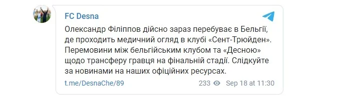 Чернігівська Десна підтвердила інформацію про перемовини з Сент-Трюйденом щодо Олександра Філіппова у своєму телеграм-каналі.