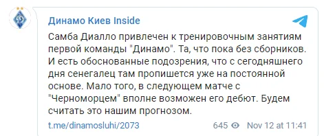 І є обґрунтовані підозри, що від сьогодні сенегалець там пропишеться вже на постійній основі. Мало того, у наступному матчі з Чорноморцем цілком можливий його дебют. Вважатимемо це нашим прогнозом", – повідомляє Telegram-канал "Динамо Київ Inside".
