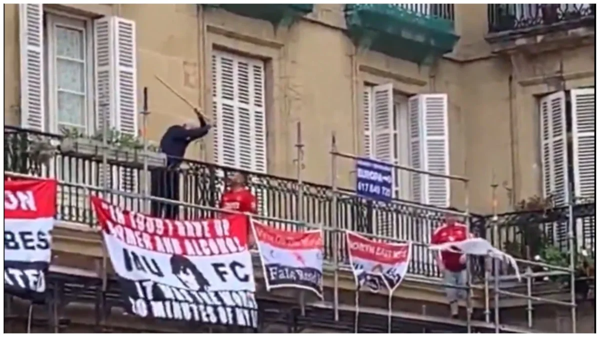 Уболівальники Юнайтед скористались будівельними риштуваннями, щоб дістатися балкона й повісити на ньому банер. Та місцевий мешканець вирішив діяти без розмов – дістав палицю й агресивно відганяв непроханих гостей, не давши їм закріпити символіку на своїй власності.