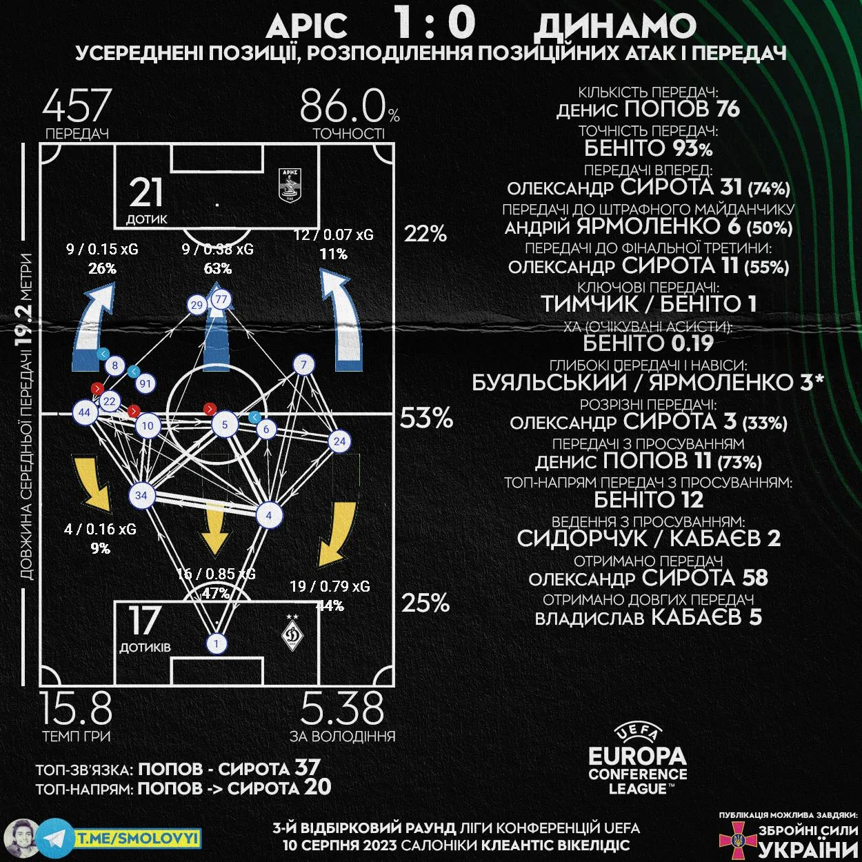Такий футбол разом із загальною обережністю киян вилився у вкрай слабкі цифри просування. Середня довжина передач до фінальної третини становила аж 30 метрів, і лише кожна 10 передача йшла на фінальну третину – при цьому їхня точність склала всього 64%. Середній блок Аріса реально задушив атаку Динамо.