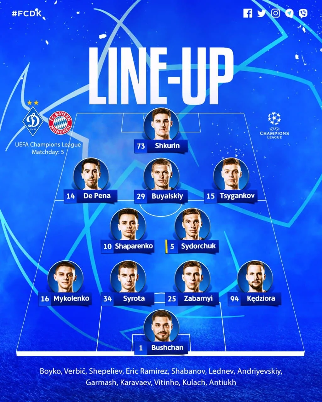 Динамо: Бущан – Кендзьора, Забарний, Сирота, Миколенко – Сидорчук, Шапаренко – Циганков, Буяльський, Де Пена – Шкурін
