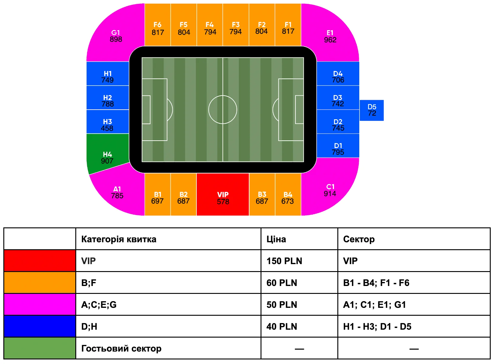 Перепустки на матч доступні для придбання на онлайн-порталі. Вартість квитків складає від 40 до 150 польських злотих (приблизно від 320 до 1200 грн.), залежно від обраного сектора. Купити тікети можна і в касах стадіону імені Владислава Крола.