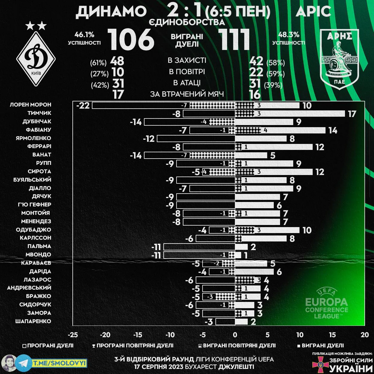 Словом, захисникам киян сьогодні буде несолодко, але є і плюси – в боротьбі турки мають слабенькі цифри. Того ж не скажеш про підопічних Мірчі Луческу. Динамо впевнено перемагало в боротьбі Минай і Чорноморець, а з Арісом "біло-сині" тримались на рівних / були кращими у всьому, крім повітря.