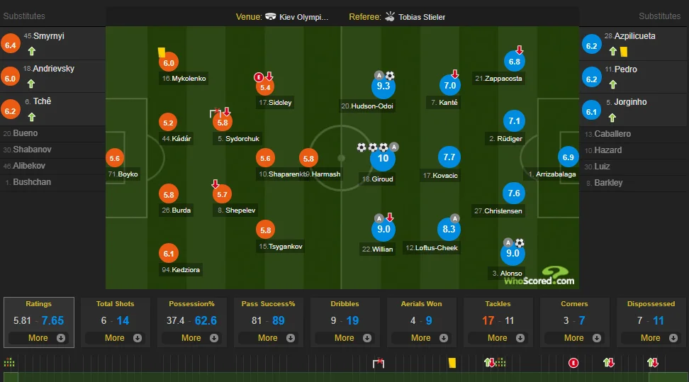 Вілліан знову робив усе, що хотів, вчергове віддав гольовий пас у матчах проти Динамо, а ще на його совісті 5 ключових передач і вдалих обведень. Та навіть не екс-вінгер Шахтаря був тим, на кого мають рівнятись юні лідери київського клубу. Хадсон-Одой реалізував свій рідкісний шанс у ролі гравця основи сповна: гол плюс асист, другий найвищий бал у матчі. Сміливість, натхненність, вражаюча ефективність та класний дриблінг. Каллум забив 4 голи в Лізі Європи – більше, ніж будь-який інший тінейджер у поточному єврокубковому сезоні.