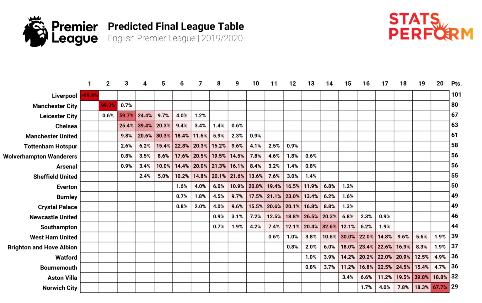 Не лякайтеся, все не так абсурдно, як вам здається. За такою моделлю Opta прогнозує фінальний розподіл місць у чемпіонатах. Для прикладу – таблиця АПЛ.