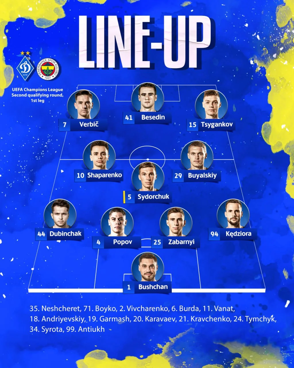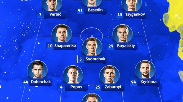 Динамо: Бущан – Кендзьора, Забарний, Попов, Дубінчак – Сидорчук, Шапаренко – Циганков, Буяльський, Вербіч – Бєсєдін