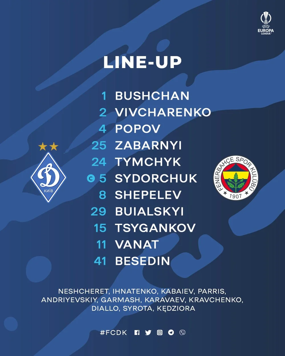 Динамо: Бущан – Тимчик, Забарний, Попов, Вівчаренко – Сидорчук (к), Шепелєв – Циганков, Буяльський, Ванат – Бєсєдін