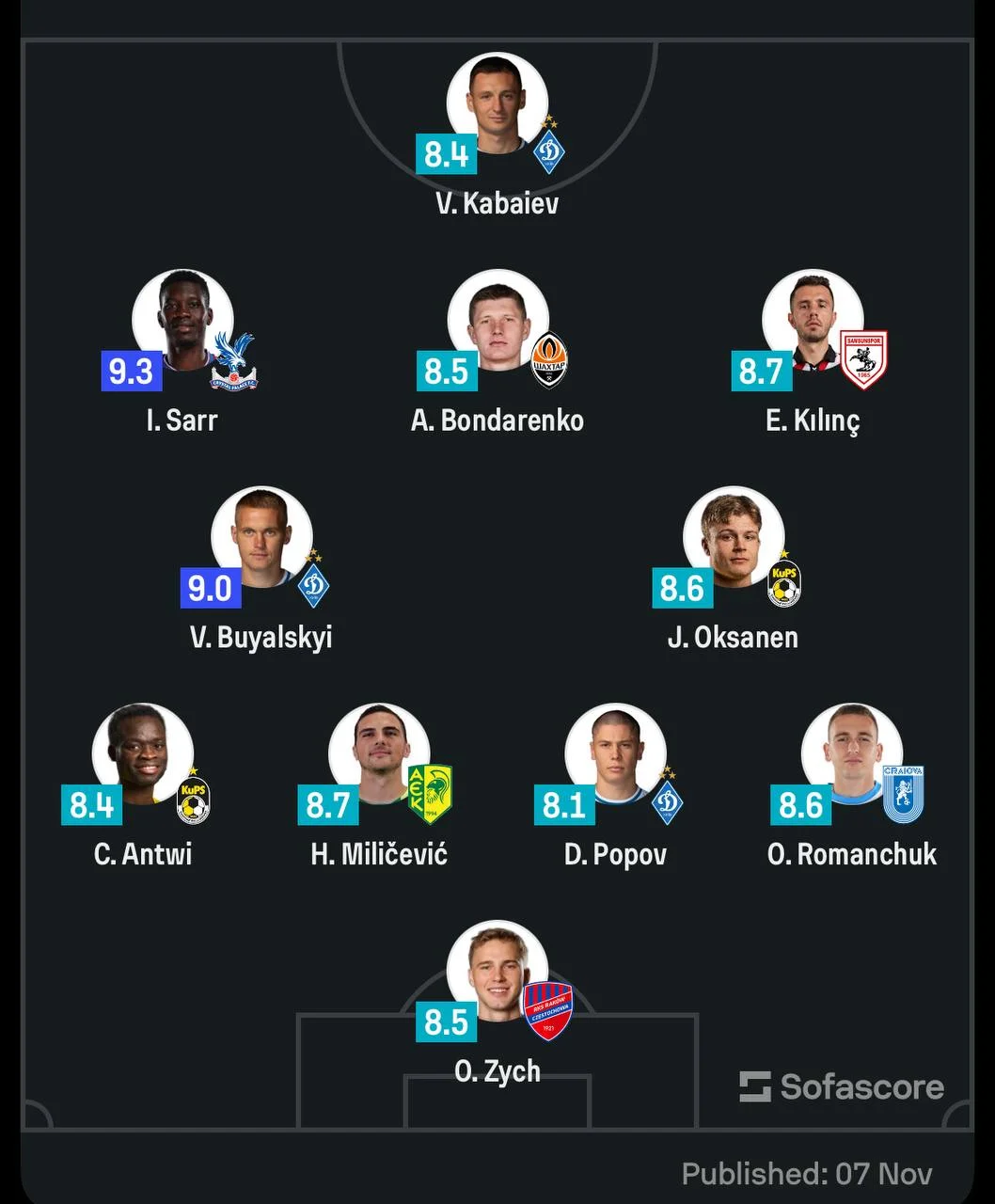 Статистичний портал Sofascore обрав збірну найкращих гравців третього туру Ліги конференцій. До символічної команди потрапили Денис Попов, Владислав Кабаєв і Віталій Буяльський з Динамо та півзахисник Шахтаря Артем Бондаренко. Також до одинадцятки найкращих гравців увійшов український захисник Універсітаті Крайови Олександр Романчук.