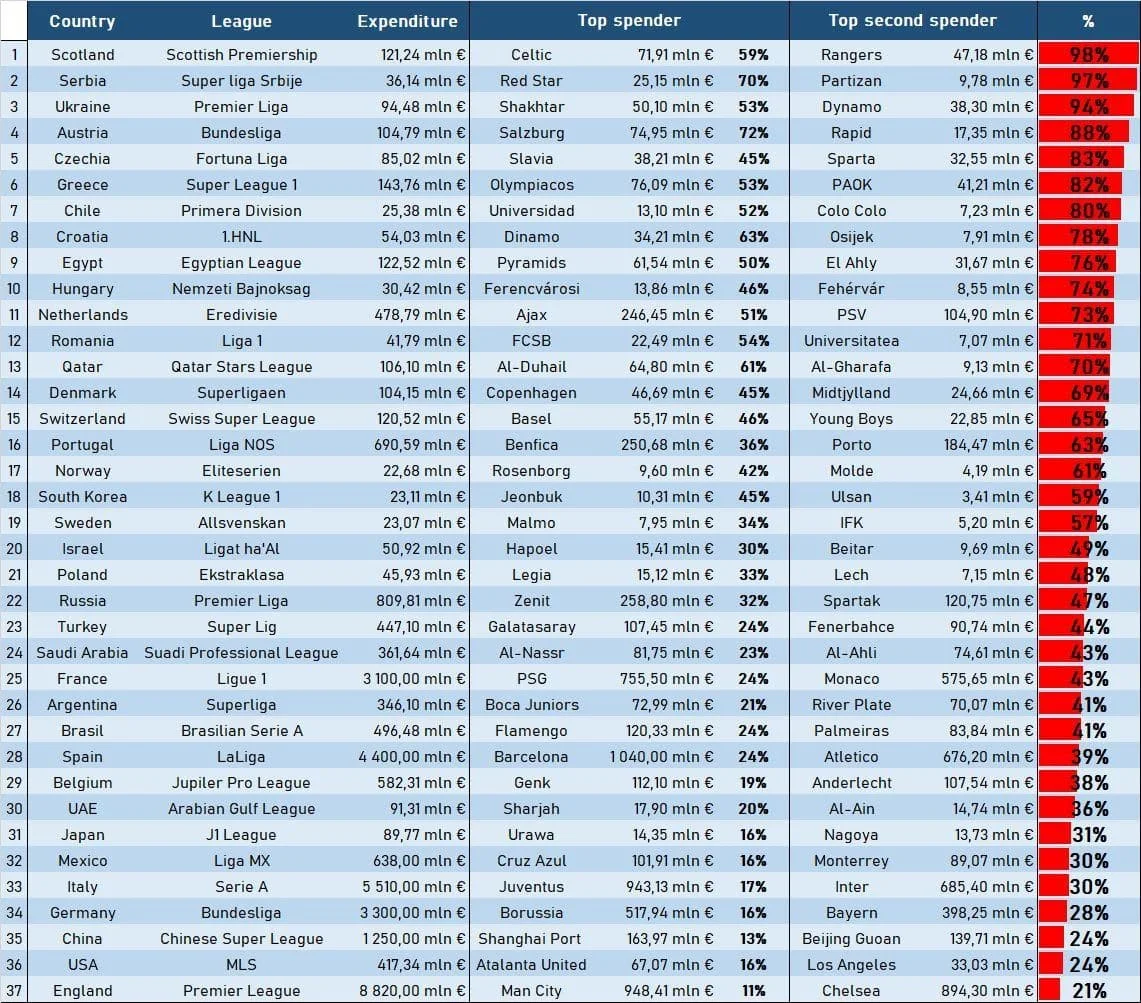 Перше місце тут посідає шотландська Прем'єр-ліга, де Селтік та Рейнджерс сумарно витрачають на покупки 98% бюджету усієї ліги. Причому спостерігається гегемонія "кельтів", у яких 59%, що дорівнює 71,91 млн євро. Другою йде Суперліга Сербії. Дует Црвена Звезда-Партизан витрачає на трансфери 97%. Третьою та останньою лігою, де витрати двох команд перевищили позначку в 90%, стала українська.