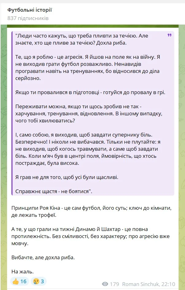Телеграм-канал "Футбольні історії" дивиться на плачевне видовище крізь призму легендарних слів безкомпромісного Роя Кіна, культового капітана МЮ 90-х і початку 2000-х.