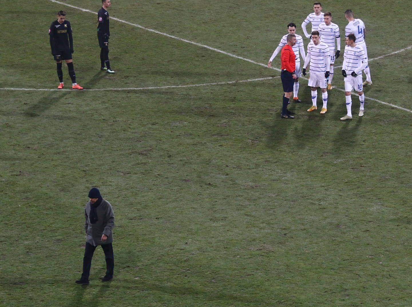 Андрієвський кволо пробив метрів з 20-ти в кінці сумного першого тайму: кияни вперше влучають у площину, голкіпер легко фіксує сферу, словом, нічого цікавого. 0:0 – справедливий підсумок стартових 45 хвилин. Від гри на цьому газоні було б несправедливо вимагати більше. Навіщо ми взагалі граємо у футбол 12 грудня…