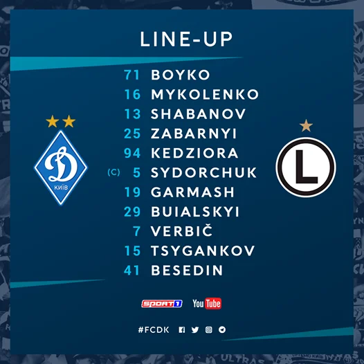 Відзначаємо велике повернення форварда киян. Артем Бєсєдін через дискваліфікацію не грав з грудня 2019 року. Цікаво, що на більшості позицій у стартовому складі виходять основні виконавці при Луческу, але є деякі цікаві моменти з гравцями, які отримували мало ігрової практики: Бойко у воротах, Шабанов у центрі захисту, Гармаш у середині поля. У Легії з перших хвилин зіграє екс-гравець молодіжної збірної України Валеріане Гвілія.