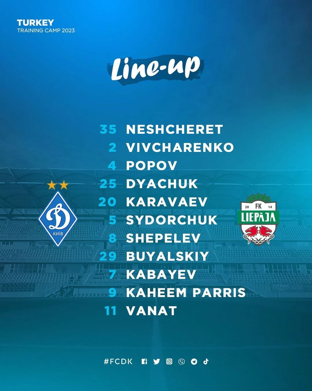 Відзначаємо велике повернення в основу Віталія Буяльського, Кахіма Перріса (обидва пропустили всі попередні матчі у 2023 році) та Владислава Ваната (вибув на початку лютого). Стартовий склад Динамо має такий вигляд: Нещерет – Караваєв, Попов, Дячук, Вівчаренко – Сидорчук, Шепелєв – Перріс, Буяльський, Кабаєв – Ванат. Порівняно з основою, яка вийшла проти Пахтакора 3 дні тому, маємо загалом 5 змін.