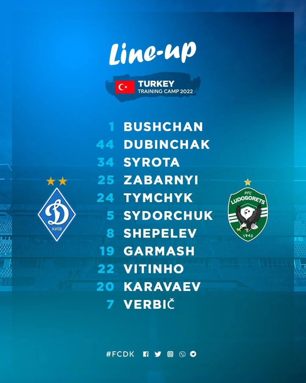 Стартовий склад Динамо: Бущан – Тимчик, Забарний, Сирота, Дубінчак – Сидорчук, Шепелєв – Караваєв, Гармаш, Вітінью – Вербіч