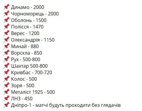 На вершині списку Динамо і Чорноморець, які можуть пускати на свої стадіони до 2000 осіб. Натомість СК Дніпро-1 став єдиним клубом УПЛ, який відмовився від квот. Причини – близька дистанція до лінії фронту та складнощі з сертифікованими бомбосховищами біля стадіону. Київські клуби, а також Металіст 1925 і Зоря поки не отримали дозвіл від військових організацій у регіоні. Луганці перший матч проти Ворскли проведуть у Житомирі без глядачів.