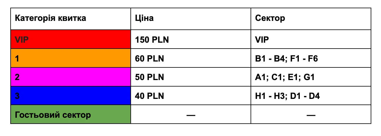 Вартість тікетів від 40 до 150 польських злотих (приблизно від 245 до 922 грн.), залежно від обраного сектора.