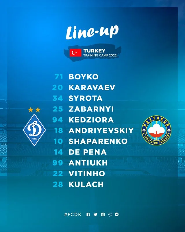 Динамо: Бойко – Кендзьора, Забарний, Сирота, Караваєв – Андрієвський, Шапаренко, де Пена, Антюх, Вітінью – Кулач