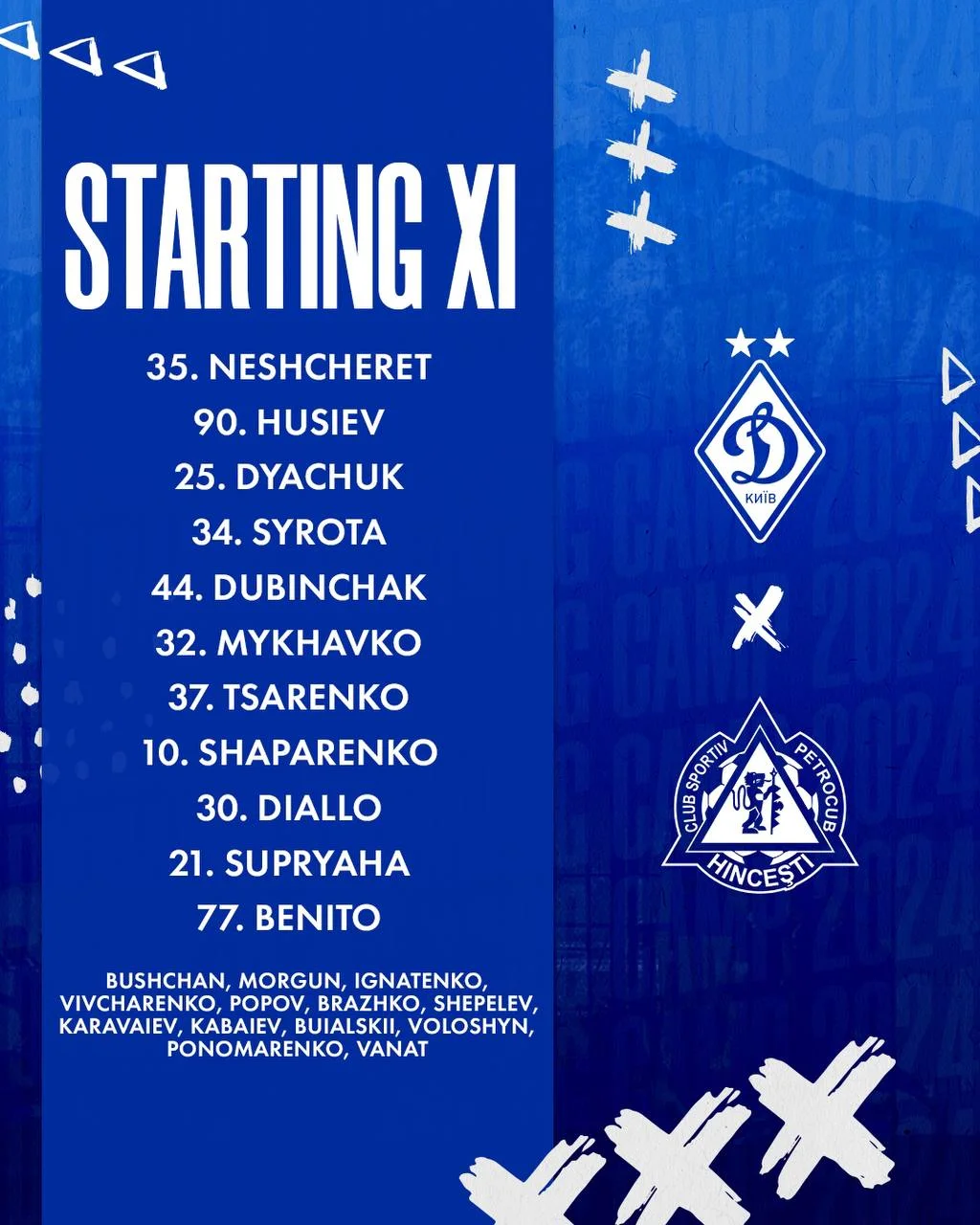 Стартовий склад Динамо: Нещерет, Гусєв, Дячук, Сирота, Дубінчак, Михавко, Шапаренко, Царенко, Беніто, Діалло, Супряга