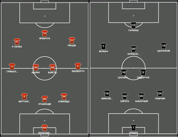 Бенфіка традиційно діяла за схемою з трьома центральними захисниками – Алмейдою, Отаменді та Вертонгеном. Знаковою була поява у стартовому складі Романа Яремчука, який став чи не найкращим гравцем матчу.