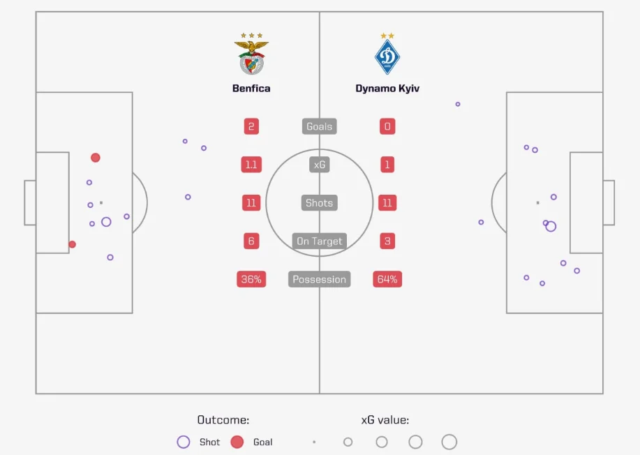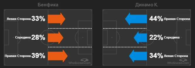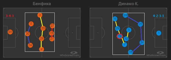 Нетипова пасивність Бенфіки за рахунку 2:0 призвела до незвичної картини на тепловій мапі та схемі активних дій. Більшість атак Динамо проходили через фланг Тимчика і Циганкова.