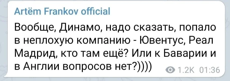 Головний редактор журналу Футбол Артем Франков іронічно відносить Динамо до компанії Ювентуса та Реала, які регулярно потрапляють в суддівські скандали.