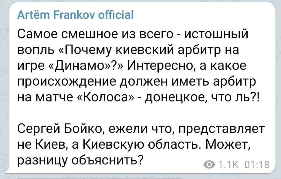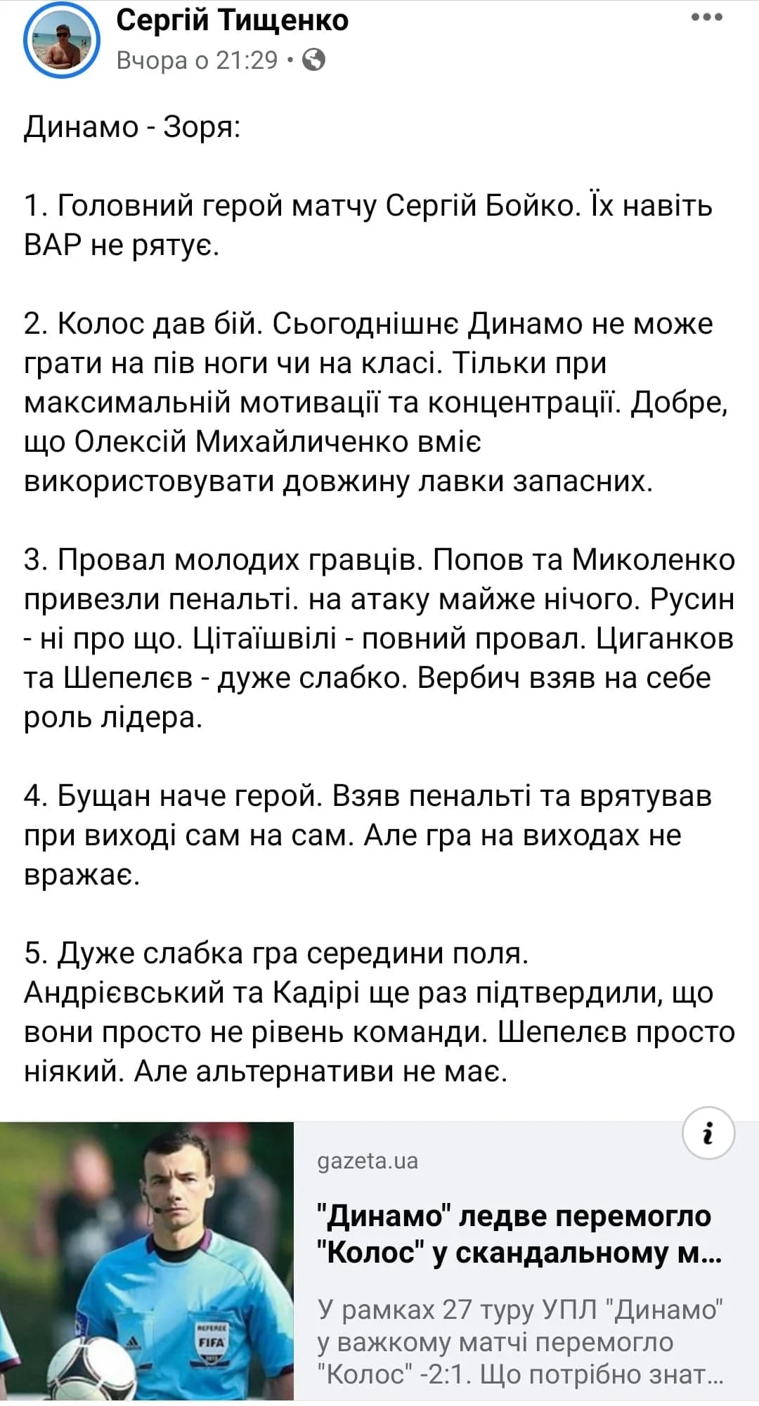 Блогер Олександр Ольшанецький вважає, що Бойко грубо помилився лише одного разу, коли не призначив пенальті за фол на Цітаішвілі: "Все інше – по ділу".
