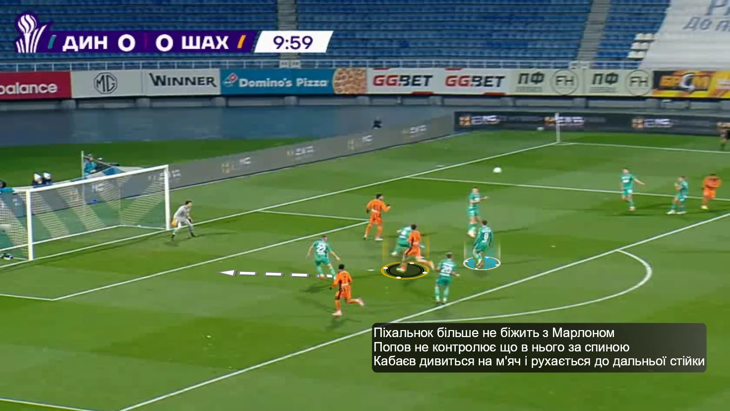 Шахтар же провів аж 9 пострілів, награвши на два голи ще до 15-ї хвилини. На 11-й динамівці не встежили за вриванням Марлона в штрафний з глибини – Піхальонок відпустив бразильця (ймовірно, сподівався на Попова), а захисники взагалі не реагували (Денис навіть не бачив вривання, дивлячись на м'яч).