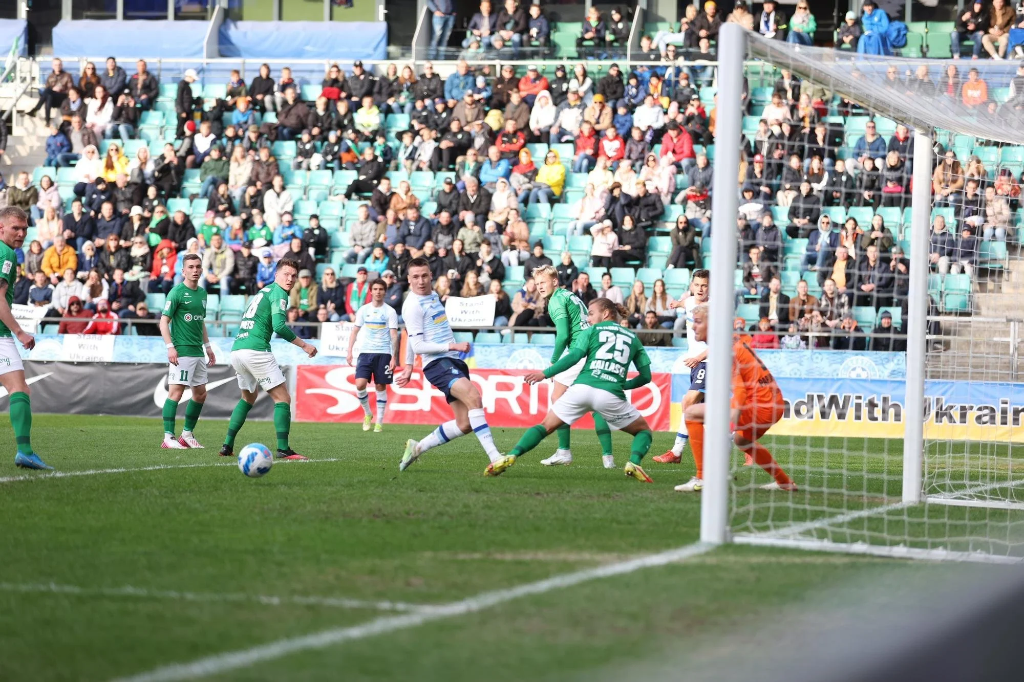 Дуже спокійний початок зустрічі. Лише воротар лідера чемпіонату Естонії двічі ледь не начудив. Спочатку почав фінтити за межами штрафного, таки обігравши Ваната. А потім вибивав у поле, зачепивши Владислава. Шепелєв непогано запресингував, відібрав і пройшов у штрафний. А ось з прострілом на центр воротарського не склалося. Після кутового Андрієвський та Вічаренко намагалися пробити, блок захисників спокійно впорався. На 16 хвилині кияни відкрили рахунок фактично з нічого. Знову організований високий пресинг. Бурда з Антюхом перехопили, Ванат продовжив, Дубінчак повів захисника за собою, а Вікентій Волошин класно заклав віраж і пробив метрів з 20.