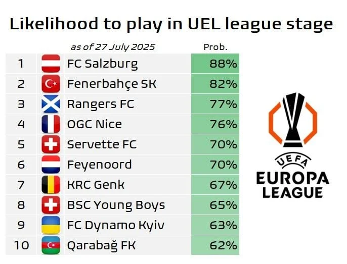 Лідером у цьому рейтингу є австрійський Зальцбург (88%), який свої виступи у єврокубках розпочав з 2-го туру кваліфікації Ліги чемпіонів, де в першому матчі розгромив норвезький Бранн (4:1). Другу сходинку посідає турецький Фенербахче (82%), який стартує з 3-го кола відбору ЛЧ проти нідерландського Фейєнорда. Третім йде Рейнджерс (77%), який у першому матчі здолав Панатінаїкос (2:0).
