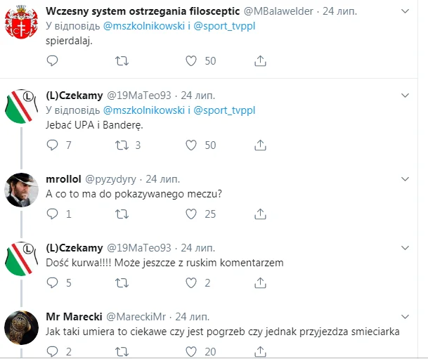 "Експеримент для українців за гроші поляків", – не зовсім так, але народу подобається – лайки сиплються. "Без сенсу. Яку ціль переслідує ця трансляція?" Школьніковскі не забарився з відповіддю: "Чи в цьому немає сенсу, стане зрозуміло після матчу. На щастя, не ти це оцінюватимеш". Директор каналу почистив свій профіль у Твіттері від особливо хамських користувачів. Дійшло навіть до погроз фізичної розправи: "Рівень хамства і кретинізму зашкалює. Уже 60. Деякі здивовані, що їх забанили за "критичну думку". А я баню тільки хамство".