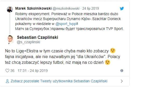 Цікавий момент. Школьніковскі чомусь продублював цю інформацію... російською мовою. Навряд чи цей чоловік розраховував на таку бурхливу та істеричну реакцію своїх земляків. Дивно, адже не так давно комерційний Polsat Sport показував матчі УПЛ. Купівля прав на Суперкубок України-2019 є досить відважною інвестицією для фактично державного телебачення, пише Sport.pl. Видання, утім, зазначає, що це може бути влучним з точки зору вигоди рішенням. Кількість українців у Польщі налічує, за різними неофіційними даними, 1-3 мільйони осіб.