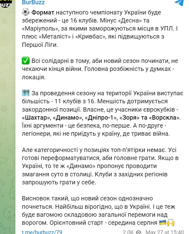 Але категоричності у позиціях топ-п’ятірки немає. Усі готові переформатуватися, аби головне грати. Якщо в Україні, то те ж Динамо пропонує проводити змагання суто в столиці. Клуби із західних регіонів запрошують грати у себе. Висновок такий, що новий сезон однозначно почнеться. Найбільш вірогідно, що в Україні. І це теж буде вагомою складовою загальної перемоги над ворогом. Орієнтовний старт – середина серпня", – написав Бурбас.