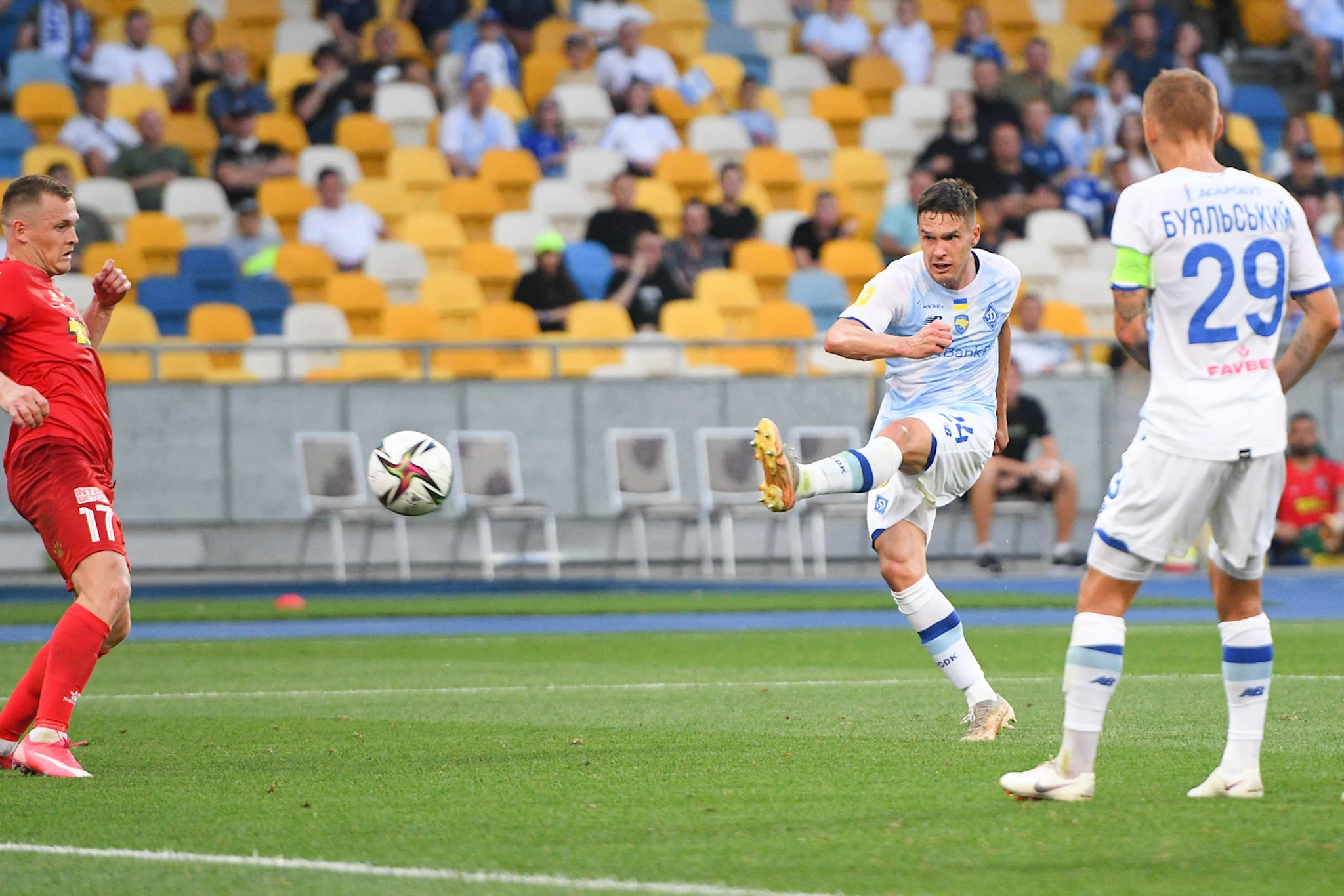 Динамо в середині першого тайму обмежувалось загальною ігровою перевагою та натяками на моменти, однак до справжнього загострення справа не доходила. Після епізоду з Гегедошом ще й довелося змінювати Попова, який при фолі на фланзі примудрився отримати пошкодження. Дениса замінив Забарний.
