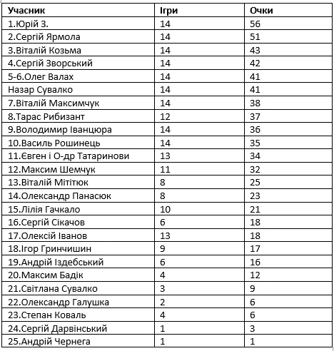 Залишилося розіграти фінальний комплект призів і головний трофей сезону, який, попри солідний відрив Юрія З., ще йому не належить – потрібно зробити останній крок. Результати 15-го туру (увага!) будуть оголошені вже через тиждень – 21 травня, о 21:00.
