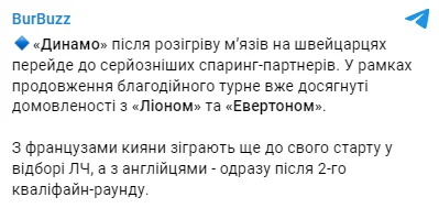 З французами кияни зіграють ще до свого старту у відборі Ліги чемпіонів, а з англійцями – одразу після 2-го кваліфайн-раунду", – повідомляє Telegram-канал BurBuzz.