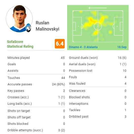 Якщо взяти дані Sofascore, то 27-річний українець заробив лише 7-й бал за відведені йому 45 хвилин після перерви (6,4). Руслан віддав 24 точні передачі (з 80% успішності, краще тільки в захисника Мас'єлло та Папу Гомеса), створив 2 гольові моменти для удару партнерам (лідер серед бергамаскі), був бездоганним у прострілах і дальніх пасах. Маліновський двічі обводив суперника (більше тільки Ілічіч), а одного разу не зумів. По 4 рази фолив сам і заробляв на собі стандарти (найкращий у гостей). Виграв єдину повітряну дуель, а ось внизу – лише 6 з 16 єдиноборств. Від Whoscored екс-хавбек Зорі та Генка удостоївся 6,63, поступившись тільки Де Рону, Ілічічу та Госенсу.