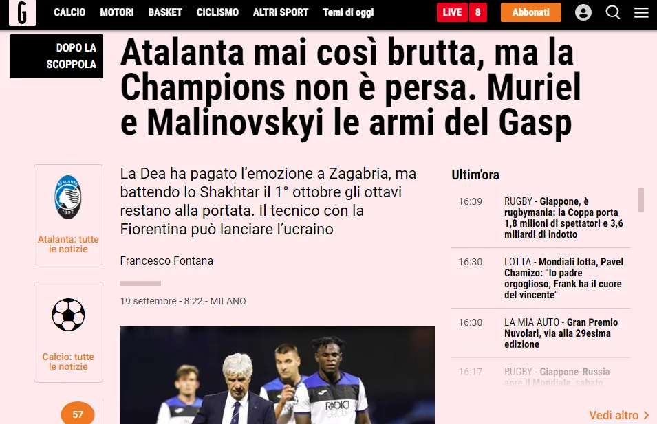 Італійські ЗМІ не шкодують критичних стріл у бік італійської сенсації. Приємно, що найпопулярніше видання країни La Gazzetta dello Sport бачить потенціал в особі українського новачка команди Гасперіні. "Аталанта ніколи не була настільки поганою, але Ліга чемпіонів ще не програна. Маліновський і Мурієль є зброєю Гаспа", – у статті під таким заголовком Франческо Фонтана шукає шляхи виходу з важкої турнірної ситуації. "Богиня заплатила за емоційний переляк, але якщо поб'є Шахтар 1 жовтня, збереже шанси на плей-офф. Проти Фіорентини 22 вересня тренер може випустити українця.