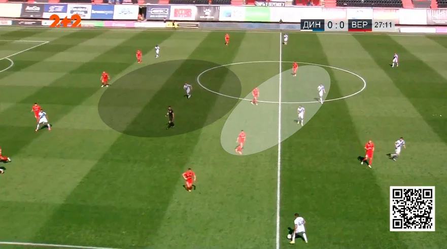 Верес створює чисельну більшість в опорній зоні, але Буяльський відкривається за спинами. Віталій отримає м'яч, але змушений буде розвернути атаку назад.