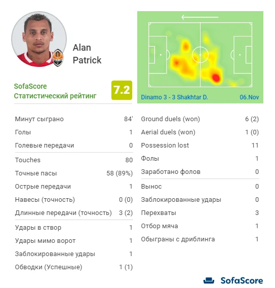 Патрік 80 разів зустрівся із м'ячем і за 84 хвилини встиг віддати 58 точних передач (89 % від усієї кількості пасів). Окрім того, він віддав 1 гостру передачу, а 2 із трьох його довгих пасів були точними. На фоні слабких взаємин Шахтаря із пресингом (його, видається, майже не було) важливими також є 3 перехоплення Патріка та 1 відбір у його виконанні.