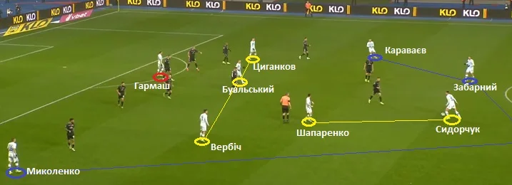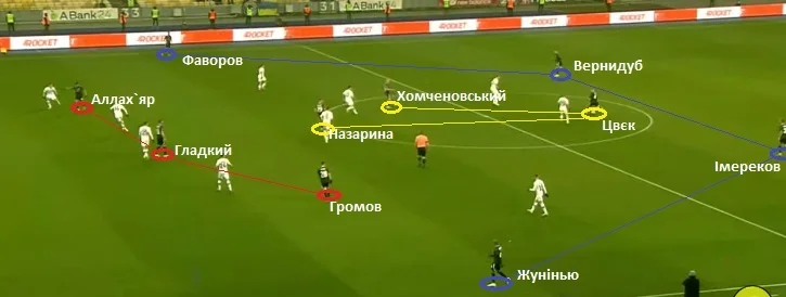 На скриншоті вище видно, як Цвєк персонально тримав Буяльського. Взагалі, кожен півзахисник луганського клубу мав свій орієнтир у деструктивній фазі.