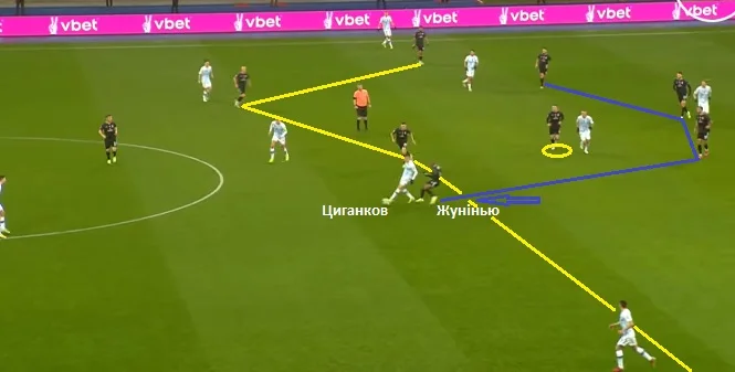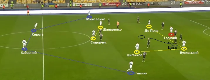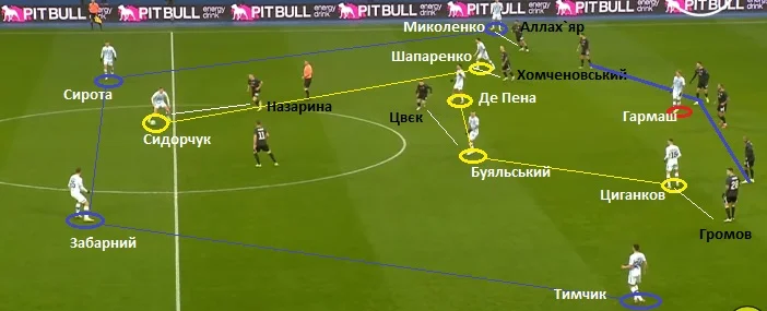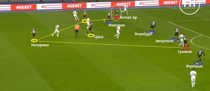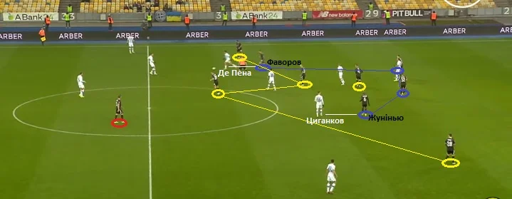 Коли вінгери Динамо займали більш глибокі чи широкі позиції, то їх тримали Громов та Аллах`яр. Коли Циганков і Де Пена підіймалися до лінії атаки та зміщувалися у півпростір, їх контролювали Жунінью і Фаворов.