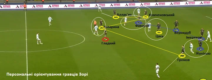 Ось на цьому зображенні можна побачити, хто за кого відповідав. Назарина і Хомченовський контролювали опорників киян. Звісно, по ситуації, хавбеки Зорі передавали своїх візаві партнерам. Загалом, у команди Скрипника була одна лінія оборони, з захисників, а півзахисники намагалися контролювати суперників один в один. У першому таймі у Зорі були великі труднощі, бо футболісти Динамо чудово рухались та постійно мінялися позиціями.