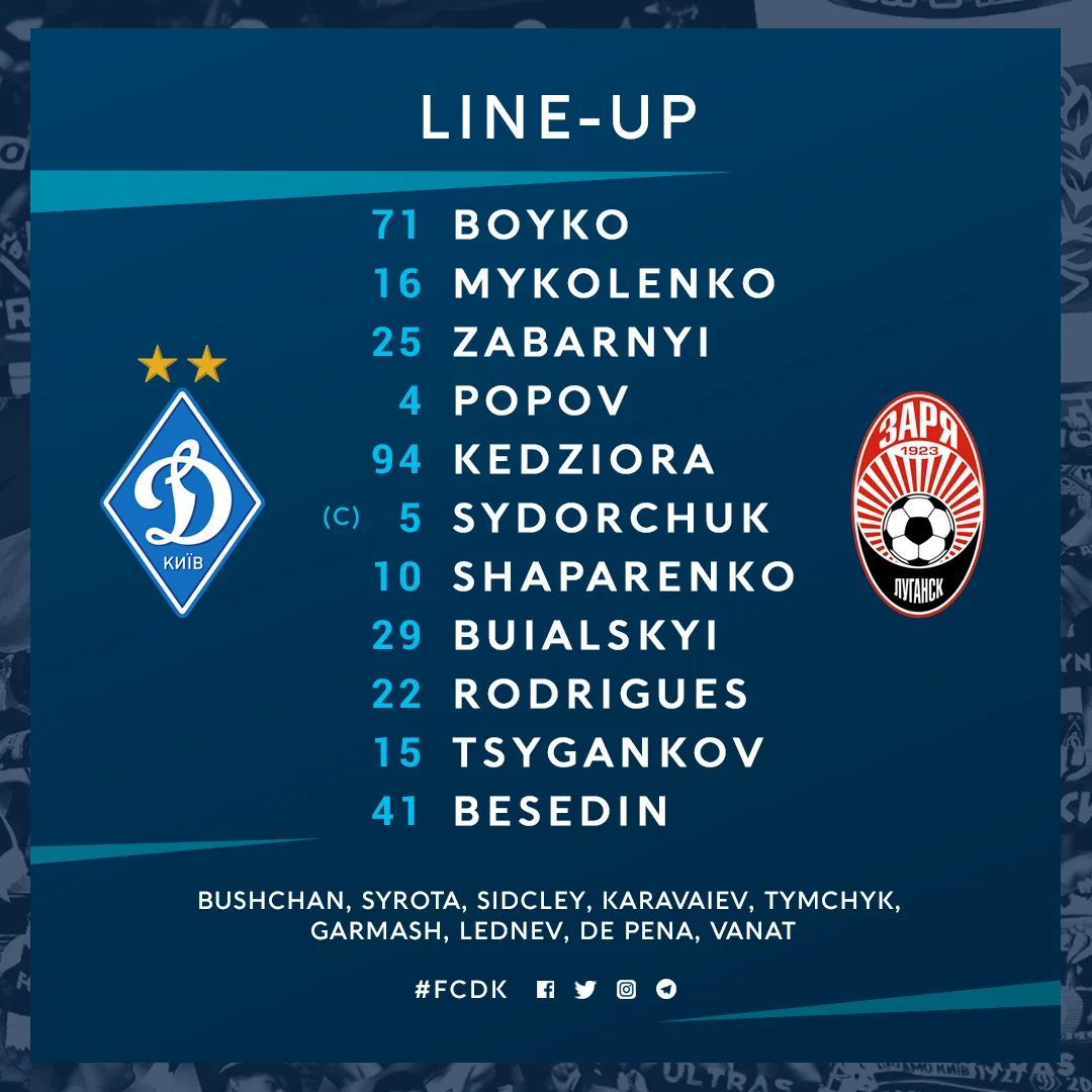 Динамо: Бойко – Кендзьора, Попов, Забарний, Миколенко – Сидорчук (к), Шапаренко – Циганков, Буяльський, Жерсон Родрігес – Бєсєдін