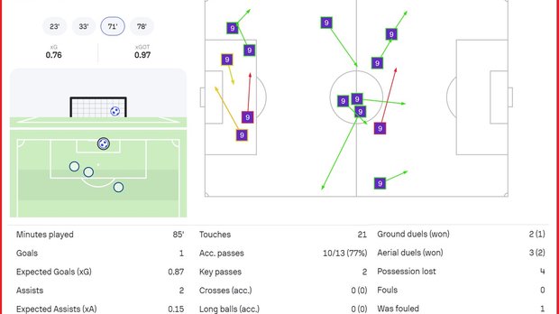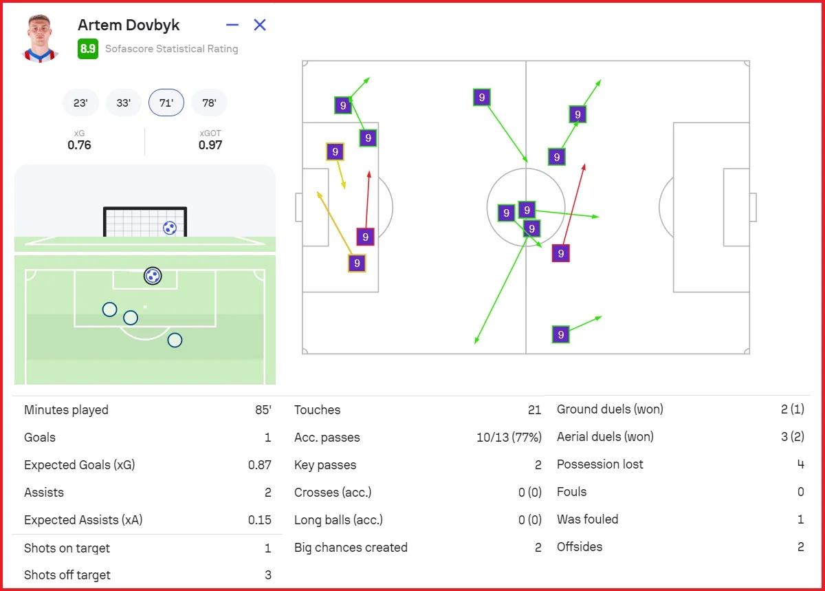 Довбик став найкращим гравцем матчу за версією SofaScore, отримавши 8,9 бала. Крім трьох результативних дій, в активі нашого нападника 77% точності передач (10/13) і непоганий показник виграних єдиноборств (2/3). Циганкова за понад 20 хвилин гри оцінили у 7,3 бала – це третя оцінка в команді після Артема і Алейша.