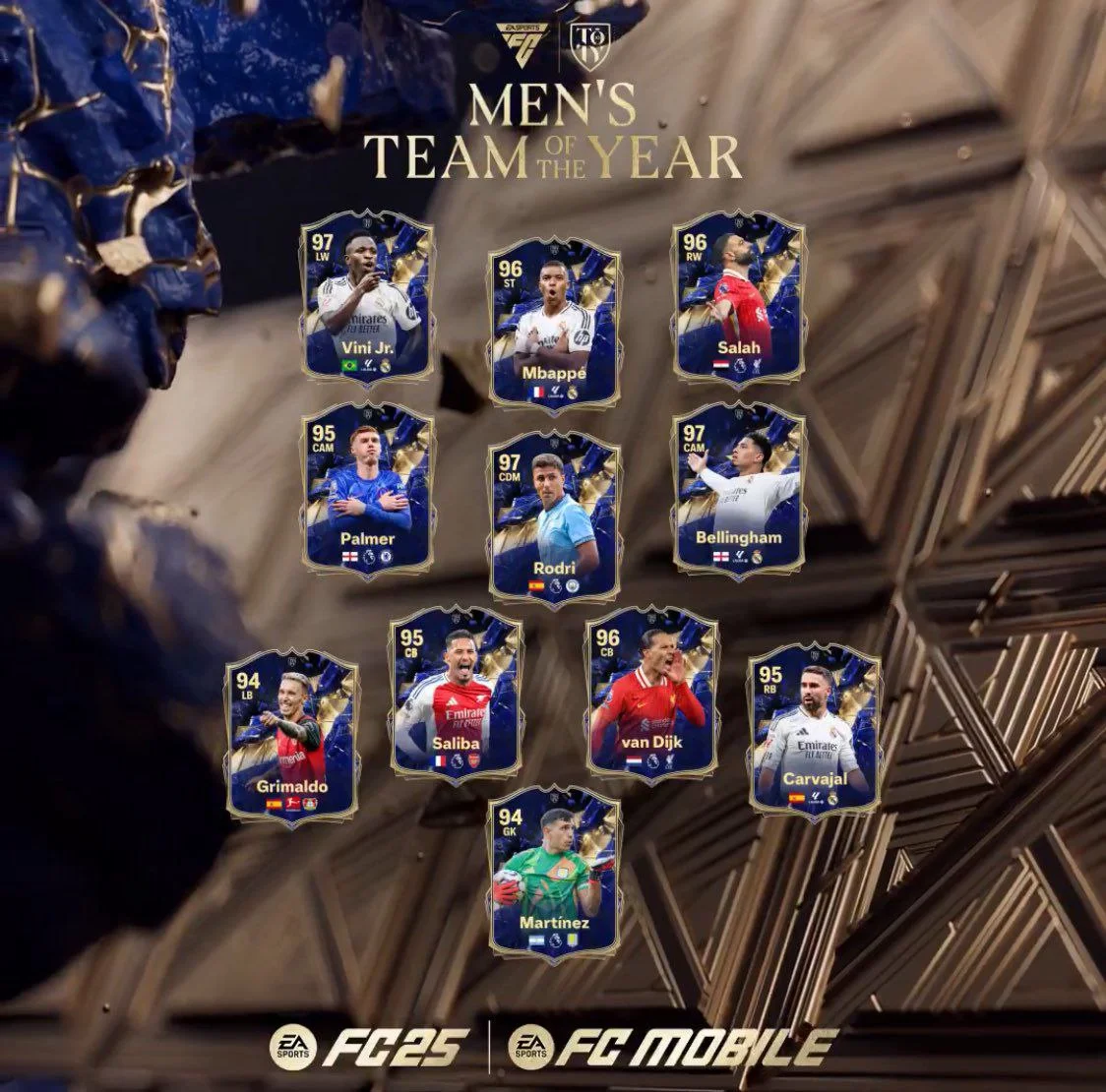 У півзахисті опинились володар "Золотого м'яча-2024" Родрі (Манчестер Сіті), Джуд Беллінгем (Реал) та Коул Палмер (Челсі), а в нападі – Вінісіус, Кіліан Мбаппе (обидва – Реал) та Мохамед Салах (Ліверпуль).