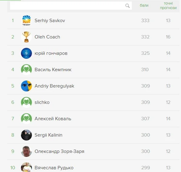 За титул чемпіона тижня розгорнулася справжнісінька заруба. Зрештою, на першій сходинці опинився Serhiy Savkov – 333 очки. І лише одним балом йому поступився Oleh Coach (332). Обидва учасники – терті калачі, грають у нашому турнірі вже дуже давно. Станом на сьогодні пан Сергій зробив понад 52300 прогнозів, пан Олег – понад 48600. Не скидайте обертів, друзі!