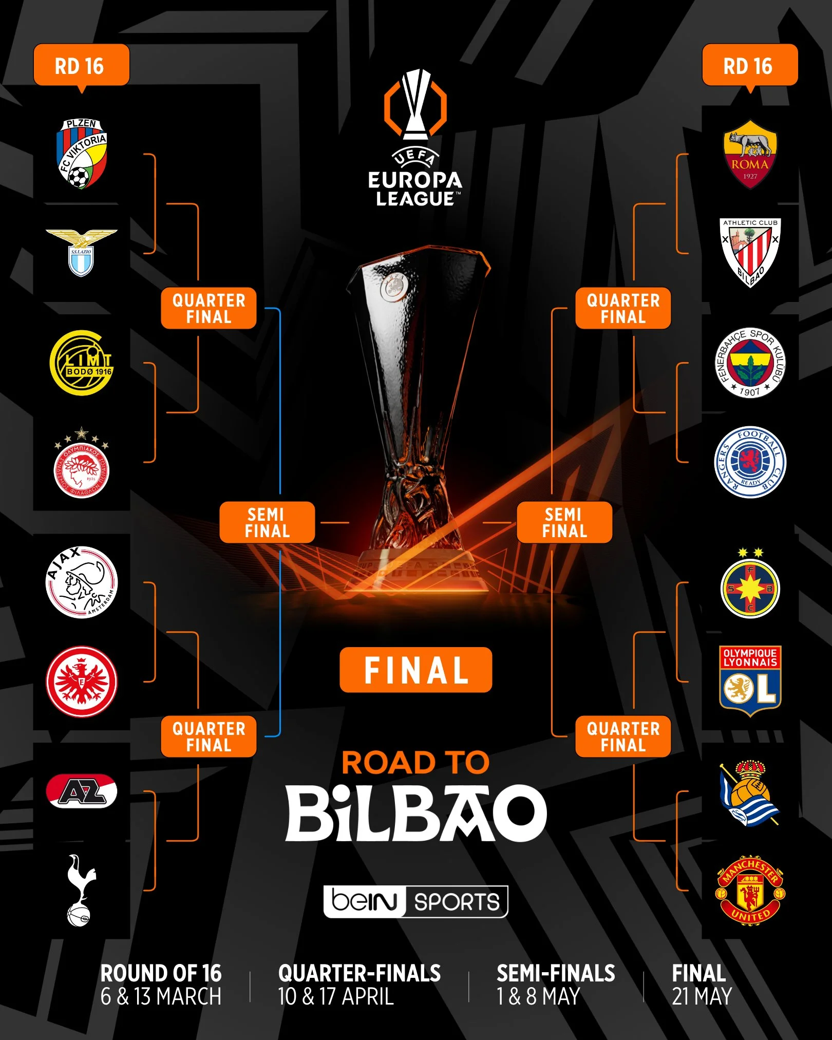 Матчі 1/8 фіналу пройдуть 6 та 13 березня, чвертьфінали заплановані на 10 та 17 квітня, півфінали відбудуться 1 та 8 травня. Фінал заплановано на 21 травня на стадіоні Сан Мамес в іспанському Більбао.