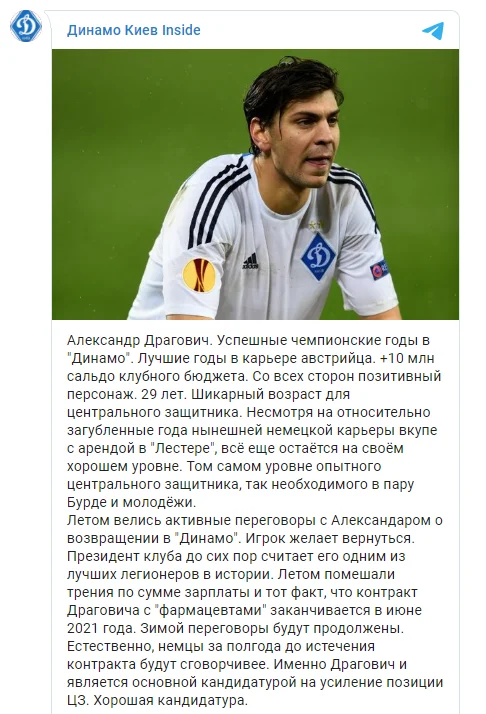 Влітку не домовились щодо суми зарплати, окрім того завадив той факт, що контракт Драговіча з "фармацевтами" закінчується у червні 2021 року. Взимку переговори продовжаться. Німці за півроку до закінчення контракту будуть поступливішими. Саме Драговіч і є основною кандидатурою на підсилення позиції центрального захисника", – повідомляє Telegram-канал "Динамо Киев Inside".