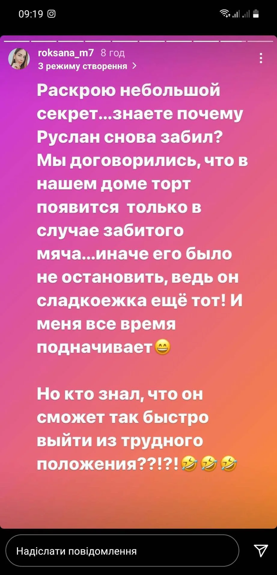 "Розкрию невеличкий секрет... Знаєте чому Руслан знову забив? Ми домовились, що у нашому будинку торт з'явиться лише після забитого м'яча.